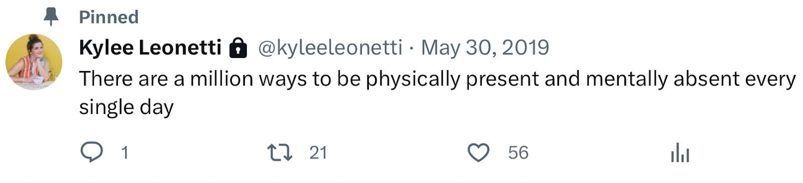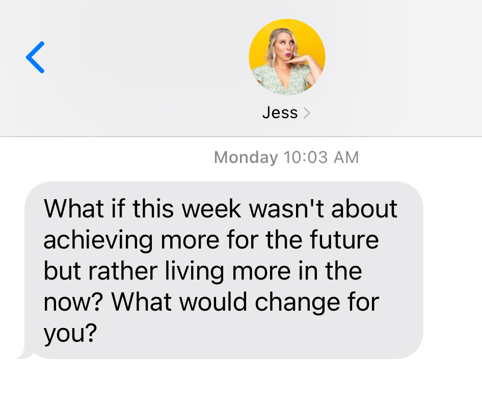 You know how when something is on your radar, you seem to notice it everywhere? The algorithm of my life is serving up signs signaling me to let go and live in the now. My friend Kayla Hollatz just wrote a newsletter about this very topic! And the ever-encouraging Jess Ekstrom sent me the sparkplug of a text above, causing me to wonder what my life would look like if I lived more in tbe now: